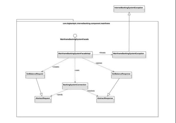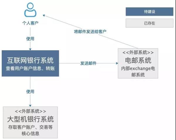 这是一个想象的待建设的互联网银行系统,它使用外部的大型机银行系统存取客户账户、交易信息,通过外部电邮系统给客户发邮件。